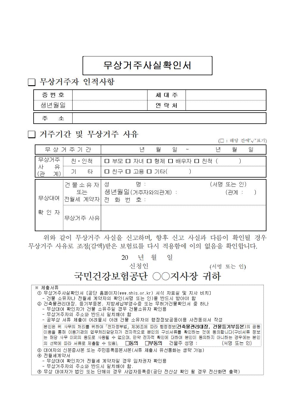 국민건강보험서식 자료실에서 가져온 무상거주사실확인서 파일입니다.