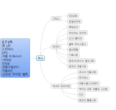 K7 중고차 2.7 LPI (2009년 11월 24일 ~ 2011년 2월) 택시 모델 세부 등급