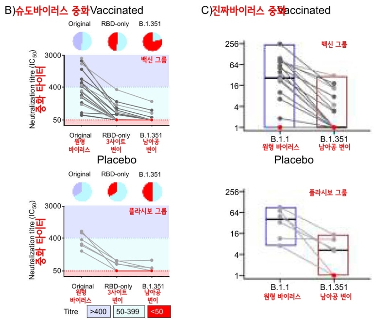 3. 남아공 변이 슈도바이러스에 대해서는 79%의 백신 접종자가 중화 능력이 없었고, 진짜 남아공 변이 바이러스에 대해서는 56%가 중화 능력이 없었다. 나머지 사람들도 2.5~31.5배 중화능력이 떨어졌다.